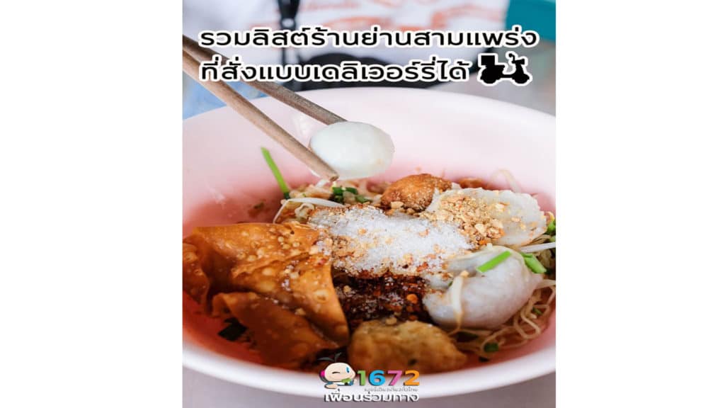 รวมลิสต์ร้านอาหาร “ย่านสามแพร่ง” ที่สั่งแบบเดลิเวอร์รี่ได้ .ย่านสามแพร่ง เรียกได้ว่าเป็นอีกย่านหนึ่งที่เป็นแหล่งรวมของกินอร่อย ๆ มากมายไว้ในที่เดียว เชื่อว่าหลาย ๆ คนที่เคยไปแล้วต้องติดใจจนอยากกลับไปอีกครั้งแน่นอน เพราะแอดก็เป็นหนึ่งในนั้น แต่เนื่องด้วยสถานการณ์การแพร่ระบาดของโรคโควิด 19 ในช่วงนี้อาจทำให้เราต้องหลีกเลี่ยงการออกเดินทางไปยังแหล่งต่าง ๆ รวมถึงการไปตะลุยกินอาหารในย่านต่าง ๆ อีกด้วย.วันนี้แอดเลยรวบรวมร้านอาหารและของทานเล่นในย่านสามแพร่ง มาให้เพื่อน ๆ สายกินได้สั่งผ่านเดลิเวอร์รี่ จะมีอะไรบ้าง ไปดูกัน.ไก่ย่างโบราณ ร้านอาหารอีสานและอาหารตามสั่งแบบแซบ ๆ พร้อมกับไก่ย่างสูตรโบราณ จานอร่อยของร้านเปิดทุกวัน เวลา 09.00-21.00 น.โทร. 02 622 2349ที่ตั้ง ถนนตะนาว แขวงศาลเจ้าพ่อเสือ เขตพระนคร กรุงเทพมหานคร.ก๋วยเตี๋ยวนายมัก เจ้าเก่า ก๋วยเตี๋ยวลูกชิ้นปลาทำเอง มากับน้ำซุปรสชาติกลมกล่อม อร่อยมากเปิดทุกวัน เวลา 09.30-15.00 น.โทร. 02 222 0093, 086 616 5340ที่ตั้ง 62 ถนนแพร่งนรา แขวงศาลเจ้าพ่อเสือ เขตพระนคร กรุงเทพมหานคร.ก๋วยจั๊บน้ำข้นมัสยา ร้านเจ้าเก่าแห่งซอยแพร่งนรา เครื่องแน่น ๆ น้ำซุปรสชาติกำลังดี เป็นอีกร้านหนึ่งที่อยากให้เพื่อน ๆ ลองเปิดวันจันทร์-เสาร์ เวลา 10.00-16.00 น. (ปิดวันอาทิตย์ และ วันหยุดราชการ)โทร. 02 223 6503ที่ตั้ง ถนนแพร่งนรา แขวงศาลเจ้าพ่อเสือ เขตพระนคร กรุงเทพมหานคร.อุดมโภชนา ร้านอาหารจานเดียวที่เปิดให้บริการมานานกว่า 80 ปี!! มีทั้งข้าวหมูแดง-หมูกรอบ ปอเปี๊ยะสดปู นอกจากนี้ยังมีข้าวสตูว์เนื้อ ข้าวแกงกะหรี่ และเมนูก๋วยเตี๋ยวให้เลือกอีกเพียบเปิดวันจันทร์-เสาร์ เวลา 07.00-15.30 น. (หยุดทุกวันอาทิตย์)โทร. 02 221 3042, 089 021 7341ที่ตั้ง 78 ถนนแพร่งภูธร แขวงศาลเจ้าพ่อเสือ เขตพระนคร กรุงเทพมหานคร.กุ้ยช่ายคุณแม่ กุ้ยช่ายแป้งบาง มีทั้งหมด 4 รสชาติ ทั้งกุ้ยช่าย หน่อไม้ เผือก และมันแกว ชิ้นพอดีคำ เสิร์ฟคู่กับน้ำจิ้มรสเด็ดสูตรของทางร้านเปิดทุกวัน เวลา 05.00-17.00 น.โทร. 081 303 0022ที่ตั้ง 520 ถนนตะนาว แขวงศาลเจ้าพ่อเสือ เขตพระนคร กรุงเทพมหานคร.ลูกชิ้นหมูแพร่งนรา ลูกชิ้นหมูแท้ 100% โดยแม่ค้าคนสวย กินกับน้ำจิ้มรสเด็ดสูตรโบราณของร้าน อร่อยสุด ๆเปิดทุกวัน จันทร์-ศุกร์ เวลา 08.00-20.00 น. เสาร์-อาทิตย์ 08.00 – 18.00 น.โทร. 081 483 2347, 061 890 1239ที่ตั้ง 544 ถนนตะนาว แขวงศาลเจ้าพ่อเสือ เขตพระนคร กรุงเทพมหานคร.เจ๊นี เผือกหิมะ เมนูล้างปากที่ทอดกันแบบ สด ใหม่ ทุกวัน เปิดกล่องมาแล้วกลิ่นหอมมากเปิดทุกวัน เวลา 08.00 – 17.00 น.โทร. 095 563 9942, 086 835 6269ที่ตั้ง 303 ถนนตะนาว แขวงศาลเจ้าพ่อเสือ เขตพระนคร กรุงเทพมหานคร.บัวลอยเกตุแก้ว บัวลอยไข่หว