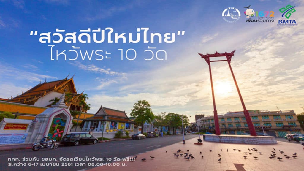 ททท.ร่วมกับ ขสมก.จัดกิจกรรม “สวัสดีปีใหม่ไทย…ไหว้พระ 10 วัด” ฟรี!! โดยจัดรถเมล์เวียนไหว้พระ 10 วัด ขึ้นระหว่างวันที่ 6 – 17 เมษายน 2561 ในช่วงเวลา 08.00 – 16.00 น. 1. วัดเบญจมบพิตรดุสิตวนารามราชวรวิหาร ที่อยู่: ถนนนครปฐม แขวงดุสิต เขตดุสิต กรุงเทพมหานคร พิกัด: https://goo.gl/maps/3hdPCro947D2 2. วัดสามพระยาวรวิหาร (วัดบางขุนพรหม) ที่อยู่: ซอยสามเสน 5 แขวงวัดสามพระยา เขตพระนคร กรุงเทพมหานคร พิกัด: https://goo.gl/maps/ZSWtysg8Vpp 3. วัดชนะสงครามราชวรมหาวิหาร ที่อยู่: ถนนจักรพงษ์ แขวงชนะสงคราม เขตพระนคร กรุงเทพมหานคร พิกัด: https://goo.gl/maps/N94LSioAnN22 4. วัดบวรนิเวศราชวรวิหาร ที่อยู่: ถนนพระสุเมรุ แขวงวัดบวรนิเวศ เขตพระนคร กรุงเทพมหานคร พิกัด: https://goo.gl/maps/qbQNj8bz9f42 5. วัดมหาธาตุยุวราชรังสฤษฎิ์ราชวรมหาวิหาร ที่อยู่: ถนนมหาราช แขวงพระบรมมหาราชวัง เขตพระนคร กรุงเทพมหานคร พิกัด: https://goo.gl/maps/c3SLtpVjQUE2 6. วัดพระศรีรัตนศาสดาราม (วัดพระแก้ว) ที่อยู่: ถนน หน้าพระลาน แขวงพระบรมมหาราชวัง เขตพระนคร กรุงเทพมหานคร พิกัด: https://goo.gl/maps/DJgMZVM3Bsx 7. วัดพระเชตุพนวิมลมังคลารามราชวรมหาวิหาร (วัดโพธิ์) ที่อยู่: ถนนสนามไชย แขวงพระบรมมหาราชวัง เขตพระนคร กรุงเทพมหานคร พิกัด: https://goo.gl/maps/hZoSqpbpFYT2 8. วัดสุทัศนเทพวรารามราชวรมหาวิหาร ที่อยู่: ถนนบำรุงเมือง แขวงวัดราชบพิตร เขตพระนคร กรุงเทพมหานคร พิกัด: https://goo.gl/maps/hJTz7fU7oJm 9. วัดราชนัดดารามวรวิหาร ที่อยู่: แขวงบวรนิเวศ เขตพระนคร กรุงเทพมหานคร พิกัด: https://goo.gl/maps/5FAz34npnfP2 10. วัดสระเกศราชวรมหาวิหาร ที่อยู่: ถนนบริพัตร แขวงบ้านบาตร เขตป้อมปราบศัตรูพ่าย กรุงเทพมหานคร พิกัด: https://goo.gl/maps/yuvxdQQkwcF2