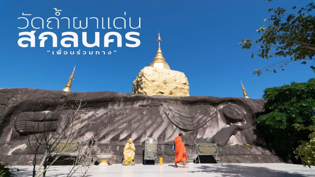 วัดถ้ำผาแด่น ตั้งอยู่บนเทือกเขาภูพาน บ้านดงน้อย ตำบลดงมะไฟ อำเภอเมือง จังหวัดสกลนคร เป็นวัดที่มีประวัติความเป็นมายาวนานนับร้อยปี ในอดีตมีพระเกจิอาจารย์สายวิปัสสนากรรมฐานหลายท่านมาจำพรรษา และปฏิบัติธรรมที่วัดนี้ เช่น หลวงปู่มั่น ภูริทัตโต เป็นต้น สิ่งแรกที่เราจะเห็นเมื่อมาถึงวัดก็คือ เจดีย์ขนาดเล็กสีทองที่สร้างอยู่บนก้อนหิน เหนือหน้าผาหินขนาดใหญ่ ด้านล่างล้อมรอบไปด้วยต้นไม้ดอกไม้ต่างๆ เปรียบได้กับเขาพระสุเมรุ ภูเขาที่เป็นหลักของโลกและจักรวาล ตามคติความเชื่อในพุทธศาสนานั่นเอง บริเวณหน้าผาหินทรายด้านล่างของเจดีย์ เต็มไปด้วยประติมากรรมแกะสลักขนาดใหญ่มากมาย ซึ่งล้วนแต่เป็นเรื่องราวที่เกี่ยวเนื่องในพระพุทธศาสนา อย่างในภาพนี้คือ พระนอนองค์ใหญ่ มีนามว่า “พระพุทธสีหไสยาสน์โลกนาถธาตุภูผาแด่น” นอกจากนี้ยังมีภาพแกะสลักหินทรายเป็นรูปพญาครุฑ ภาพหลวงปู่ทวดองค์ใหญ่ อริยสงฆ์รูปต่างๆ ของไทย รอยพระพุทธบาท และอื่นๆ อีกมากมาย  บริเวณรอบๆ วัดเต็มไปด้วยต้นไม้ดอกไม้ ที่จัดวางไว้อย่างลงตัวสวยงาม ร่มรื่น ภายในวัดยังมีจุดชมทิวทัศน์ที่โอบล้อมไปด้วยภูเขา มองเห็นตัวเมืองสกลนครและทะเลสาบหนองหาร มีเก้าอี้ให้นั่งพักรับลมเย็นๆ และมีร้านขายเครื่องดื่มให้บริการ การเดินทางจากอำเภอเมืองสกลนคร ใช้ทางหลวงหมายเลข 213 เส้นทางไปจังหวัดกาฬสินธุ์ ผ่านสี่แยกบายพาส ตรงไปจะพบสามแยกบ้านศรีวิชา ให้เลี้ยวซ้ายเข้าสู่ทางหลวงชนบทหมายเลข 2339 ตรงไปจนถึงโรงเรียนบ้านนากับแก้ จะพบสี่แยกเล็กๆ ให้เลี้ยวขวา ตรงไปจนสุดทางจะพบลานจอดรถวัดถ้ำผาแด่น  จากนั้นต้องเปลี่ยนไปใช้บริการรถสองแถวเพื่อขึ้นไปยังวัด ระยะทาง 4 กิโลเมตร ค่าบริการรับ-ส่ง คนละ 20 บาท