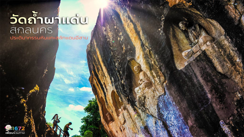 วัดถ้ำผาแด่น ตั้งอยู่ในพื้นที่บ้านดงน้อย ตำบลดงมะไฟ อำเภอเมืองสกลนคร จังหวัดสกลนคร ในอดีตมีพระเกจิอาจารย์สายวิปัสสนากรรมฐานหลายท่านมาจำพรรษาและปฏิบัติธรรมที่วัดนี้ เช่น พระอาจารย์มั่น ภูริทัตตเถระ ปัจจุบันภายในวัดเต็มไปด้วยงานประติมากรรมแกะสลักหินทรายขนาดใหญ่ โดยมักแกะสลักเป็นเรื่องราวเกี่ยวกับพระพุทธศาสนา จากในรูปนี้ คือ ภาพแกะสลักหินทรายหลวงปู่ทวดองค์ใหญ่ ซึ่งแกะจากหินขนาดใหญ่ทั้งก้อน มีช้างหมอบด้านข้างคอยปกป้อง ภาพแกะสลักหินทรายรูปพญาครุฑเวสสุวรรณ  จุดนี้ถือเป็นศูนย์กลางของวัด เจดีย์ขนาดเล็กสีทองตั้งอยู่บนก้อนหินสีทองโดดเด่น เปรียบเสมือนเขาพระสุเมรุ คือ ภูเขาที่ตั้งอยู่จุดศูนย์กลางของโลกหรือจักรวาล ตามคติความเชื่อในศาสนาพราหมณ์และศาสนาพุทธ บริเวณโดยรอบถูกประดับตกแต่งด้วยน้ำตกจำลองและไม้ดอกไม้ประดับอย่างสวยงาม ด้านหลังก้อนหินอันเป็นที่ตั้งของเขาพระสุเมรุจำลอง คือ ภาพแกะสลักพระนอนองค์ใหญ่ นามว่า “พระพุทธสีหไสยาสน์โลกนาถธาตุภูผาแด่น” นอกจากนี้ภายในวัดยังมีภาพแกะสลักพระเกจิอาจารย์สายวิปัสสนากรรมชื่อดังอีกหลายรูป ภาพแกะสลักพระพุทธรูปปางประจำวันเกิด บริเวณจุดชมวิววัดถ้ำผาแด่น มีเก้าอี้ให้นั่งพักหลบร้อนและรับลมเย็น ทั้งยังมีร้านขายเครื่องดื่มให้บริการอยู่ใกล้ ๆ กัน การเดินทางไปวัดถ้ำผาแด่น : จากอำเภอเมืองสกลนคร ใช้ทางหลวงหมายเลข 213 เส้นทางไปจังหวัดกาฬสินธุ์ ผ่านสี่แยกบายพาส ตรงไปจะพบสามแยกบ้านศรีวิชา ให้เลี้ยวซ้ายสู่ทางหลวงชนบทหมายเลข 2339 ตรงไปจนถึงโรงเรียนบ้านนากับแก้ จะพบสี่แยกให้เลี้ยวขวา ตรงไปจนสุดทางจะพบลานจอดรถวัดถ้ำผาแด่น จากนั้นต้องเปลี่ยนไปใช้บริการนั่งรถสองแถวของทางวัด ระยะทาง ๔ กิโลเมตร ค่าบริการรับ-ส่ง คนละ 20 บ. เพื่อขึ้นไปยังวัดซึ่งตั้งอยู่บนเขาและมีที่จอดรถด้านบนไม่เพียงพอ รวมระยะทางจากอำเภอเมืองสกลนคร ประมาณ 21 กิโลเมตร