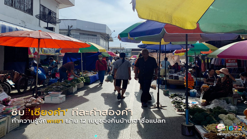 ที่ตลาดสดเทศบาล 1 คือตลาดสดหลักของ อ.เชียงคํา ที่ไม่ได้คึกคักแค่ในตัวตลาดสดที่อยู่ในร่มเท่านั้น แต่บนถนนข้างๆ ตลาดก็ยังกลายเป็นถนนคนเดินที่มีพ่อค้าแม่ขายมาปูเสื่อ กางร่ม เข็นรถเข็นมาขายอาหารเช้าแบบสุดแสนจะน่ากินราวกับว่าไม่มีใครยอมแพ้ใครเลยทีเดียว เราเริ่มจากการเข้าไปกินอาหารเช้าในร้านดังประจําตลาดที่ปูโต๊ะให้คนนั่งกินรอบคูหาก่อนจะเดินช้อปของกิ๋นถูกใจกลับมากินต่อในมื้อกลางวัน โดยวางแผนไว้ว่าจะเอาอาหารไปปูเสื่อกินกันที่นํ้าตกดังประจําถิ่น ว่าแล้วก็ไปลุยหาอาหารกัน! เมนูที่ 1 – ก๋วยเตี๋ยวนํ้าเงี้ยว.ร้านคําเอ้ย คือร้านขนมจีนนํ้าเงี้ยวเจ้าเก่าแก่ที่ตั้งอยู่ในตลาด ความคลาสสิกคือมีคุณป้ายืนเด่นทําอาหารอยู่ตรงกลางเหมือนเป็นบาร์ แล้วรอบๆ คูหาก็เป็นทีนั่งกิน ซึ่งจุคนได้ราวๆ รอบละ 4-5 คนเท่านั้นจนต้องรอคิว ซึ่ง ไม่ใช่แค่บรรยากาศของร้านที่คึกคักชวนอร่อยนะ แต่คุณแม่สามีกระซิบบอกว่า ความเด็ดของร้านป้าคือเมนูก๋วยเตี๋ยวนํ้าเงี้ยว ที่เปลี่ยนจากเส้นขนมจีนมาใส่เส้นใหญ่แทน แต่เส้นใหญ่ของที่นี่หน้าตาเหมือนเส้นเล็กนะ.พอได้ที่นั่ง เราก็สั่งเมนูเด็ดที่แม่ว่ามากิน ซึ่งคอนเฟิร์มว่ามันเด็ดจริง ไม่เพียงนํ้าซุปนํ้าเงี้ยวที่อร่อยกลมกล่อม ถั่วงอกหัวโตที่ให้เติมได้เองไม่อั้น พริกคั่วหอมๆ ที่ใส่แล้วเพิ่มความอร่อยจัดจ้าน แต่ทีเด็ดจริงๆ คือเส้นใหญ่ที่เหนียวนุ่ม กลิ่นดี ซอยมาบางๆ ให้พอซึมซับเข้ากับนํ้าซุป เป็นเมนูยามเช้าที่บอกเลยว่าฟิน ถ้ามาที่นี่ต้องแวะมากิน เมนูที่ 2 – ข้าวเกรียบปากหม้อเวอร์ชั่นพะเยา.ฟังชื่อเหมือนจะธรรมดา หากินง่ายในกรุงเทพฯ ใช่ไหม แต่ข้าวเกรียบปากหม้อของที่นี่มันไม่ใช่อย่างนั้นเลย สําหรับเราเมนูนี้คือส่วนผสมของอาหารคาวและขนมหวานแบบที่เข้ากันได้ดีสุดๆ โดยในตลาดจะมีให้เลือกสองแบบคือแบบคาวกับหวาน เราเลือกแบบคาวกลับมาลองกิน สิ่งที่แปลกคือข้าวเกรียบปากหม้อที่นี่เปนไส้หน่อไม้ผัดหมูสับ ห่อด้วยแป้งบางเฉียบ โรยด้วยตั้งไฉ่ที่มีรสเค็มนิดๆ แต่ดันราดด้วยนํ้ากะทิ! พอชิมเข้าไปแล้วกลับกลายเป็นความเค็มหน่อยๆ มันนิดๆ ราดลงไปบนเท็กซ์เจอร์นุ่มนิ่ม และไส้แสนอร่อยกรุบๆ ที่สุดจะลงตัว สรุปว่าชอบจริงจังจนอยากให้มีแบบนี้ขายที่กรุงเทพฯ บ้าง เมนูที่ 3 – แกงกระด้าง.เคยได้ยินเมนูแกงกระด้างมาบ้างเวลาไปเที่ยวเชียงใหม่ แต่ก็ไม่มีโอกาสได้ชิมเพราะฟังชื่อแล้วดูไม่น่าอร่อย พอมาเที่ยวพะเยาเราได้เจอขายอยู่ในตลาดแทบทุกวัน บวกกับคิดว่าวันนี้อยากได้อาหารเที่ยงที่พกพาง่ายไปกินที